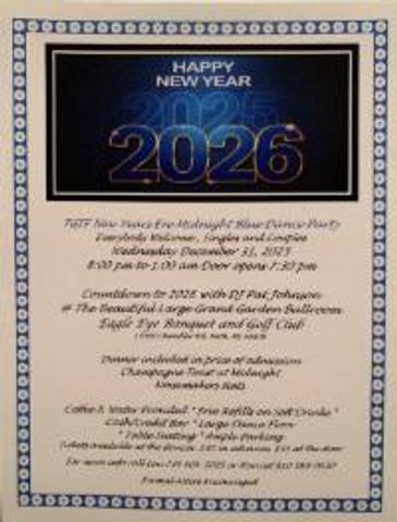 Countdown to 2026 with DJ Pat Johnson 8 PM-1 AM. Doors open 7:30 PM. Dinner included in price of admission. Champagne Toast at Midnight. Noisemakers/Hats. Formal Attire Encouraged